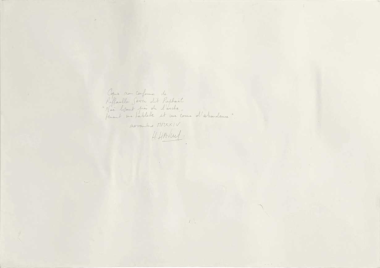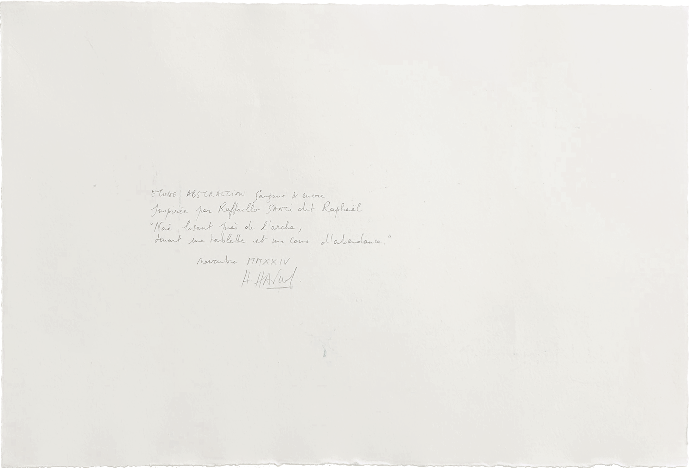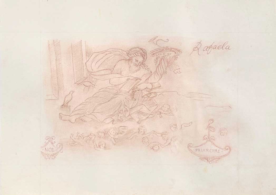 "Le choix de ce dessin consultable au cabinet d'art graphique du Louvre est une référence à l'ancien testament, plus particulièrement au chapitre 8 de la Genèse. "Le septième mois, le dix-septieme jour du mois, l'arche s'arrêta sur la montagne d'Ararat" (...)